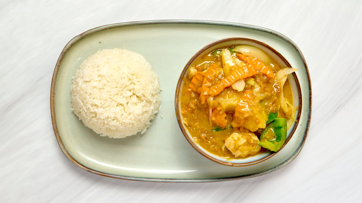 Stark. Serveras med gul curry, kokosmjölk, lök, morot, bambuskott, paprika och vattenkastanjer.