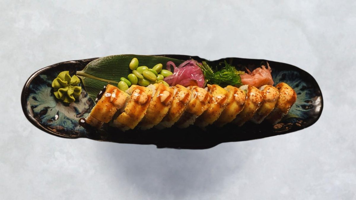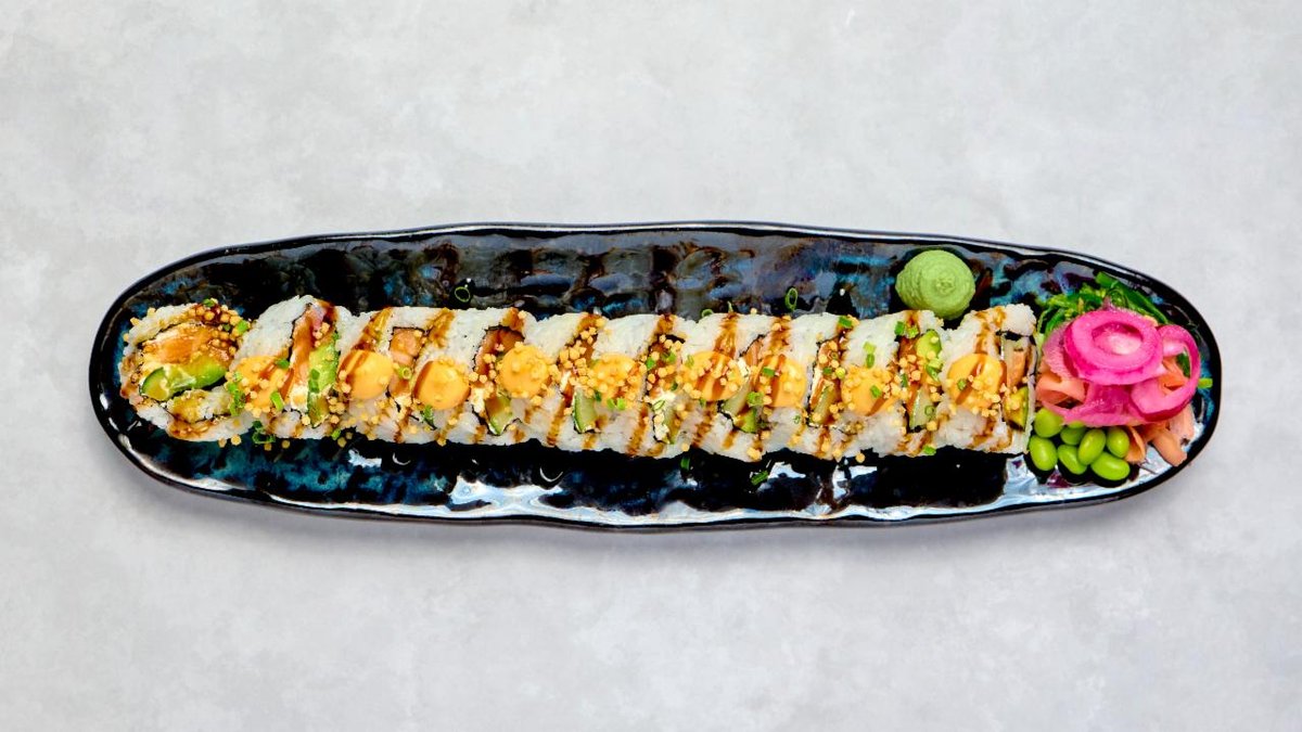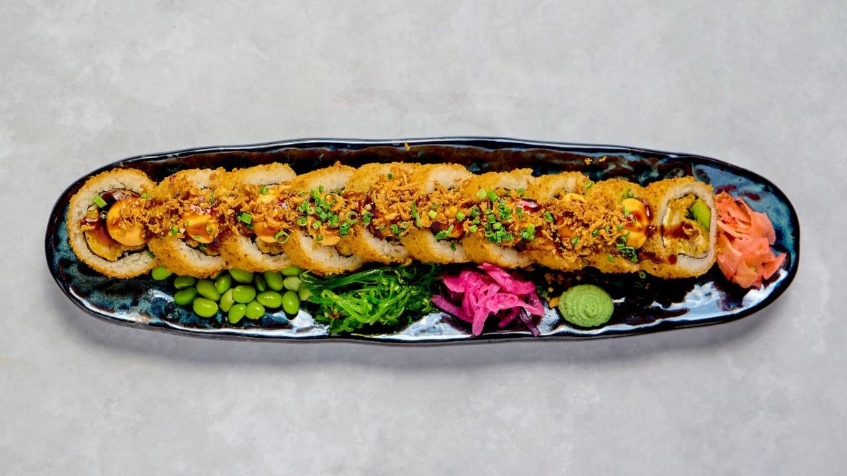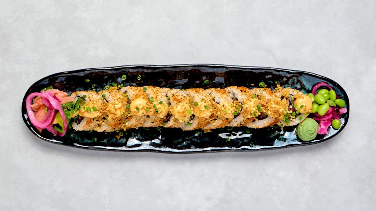 Tempuraräka & avokado. Toppas med avokado, chilimayo, teriyakisås, gräslök & rostad lök.