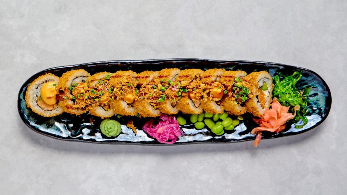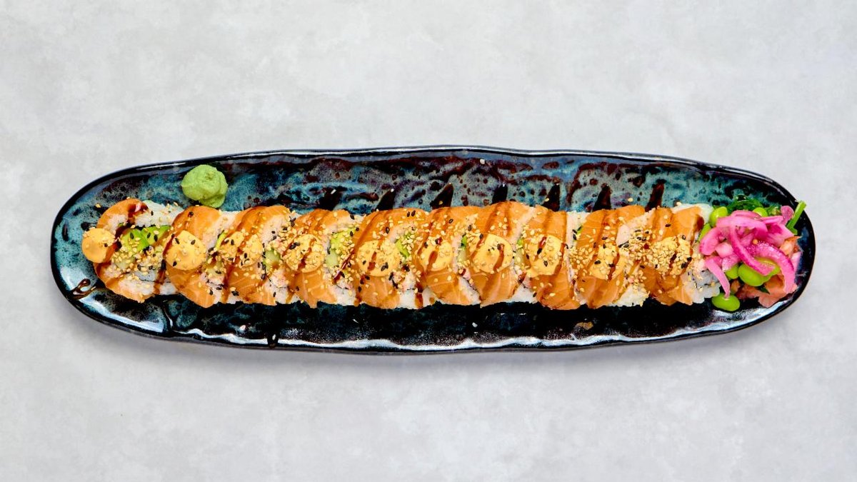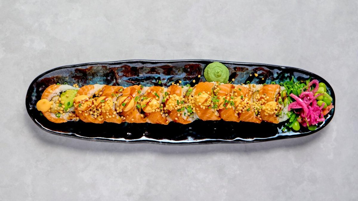 10 bitar - Friterad rulle med lax, avokado, färskost. Toppas med chilimayo, teriyakisås & rostad lök.