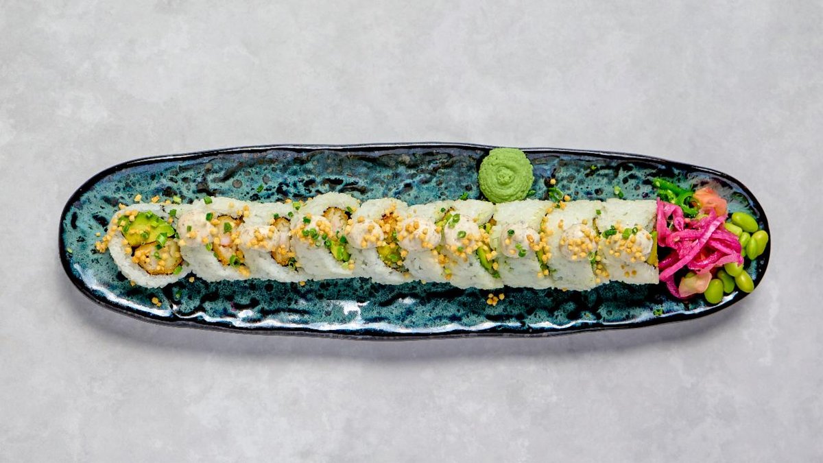 Tofu, gurka, avokado & färskost. Toppas med teriyakisås, rostad lök & gräslök.