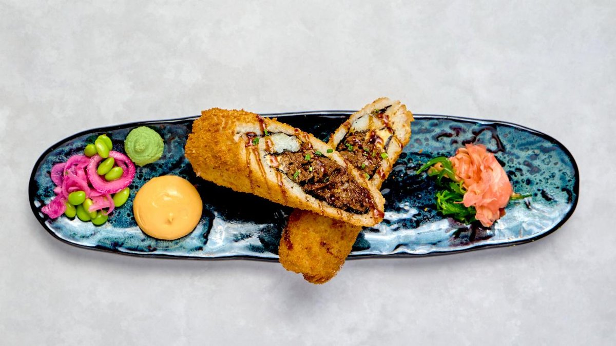 10 bitar - Friterad rulle med entrêcote & riven ost. Toppas med chilimayo, teriyakisås & rostad lök.