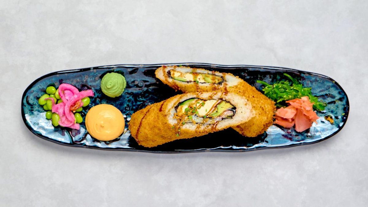 Friterad rulle med tofu, gurka, avokado & färskost, toppas med teriyakisås, rostad lök & gräslök. Serveras med valfri dipp.