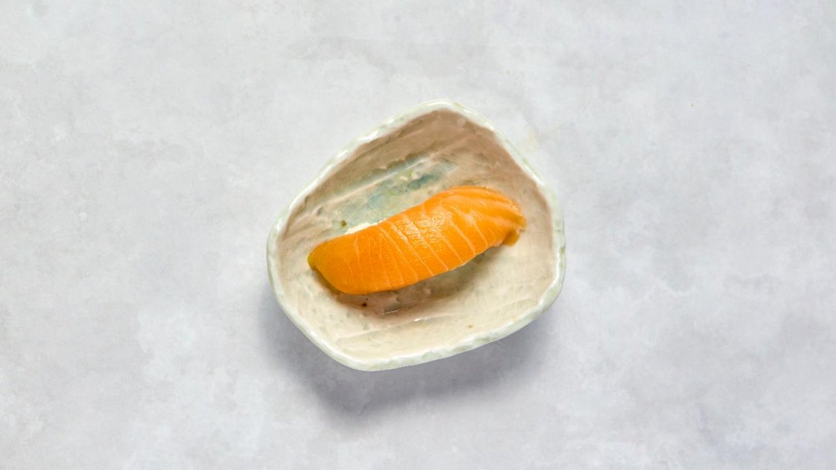 1 nigiri med lax, tryffelmayo & rispuffar.