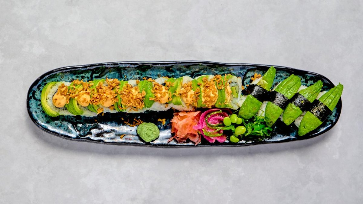 Avokado & gurka. Toppas med avokado, rostad lök & vegansk chili mayo.