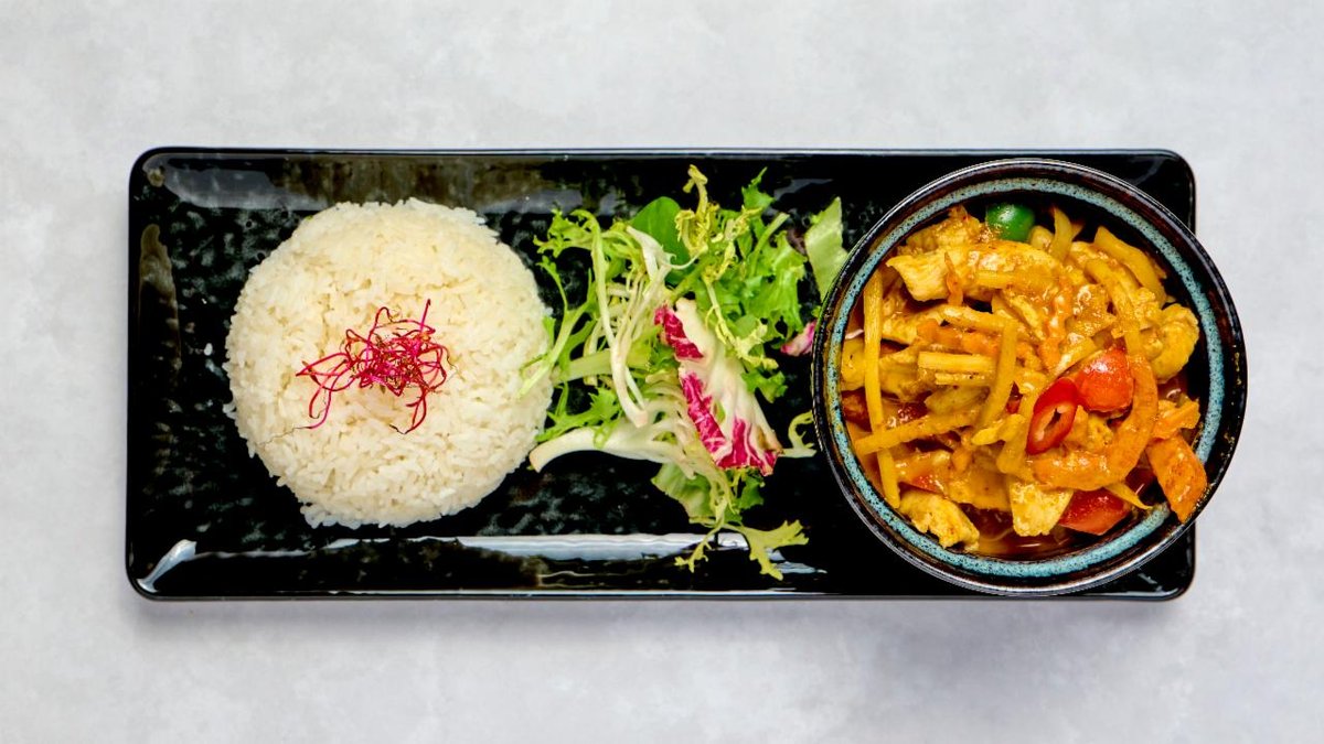 Thaicurry gjord på kokosmjölk, jasminris, lök, vitlök, morot, broccoli, paprika, bambuskott.