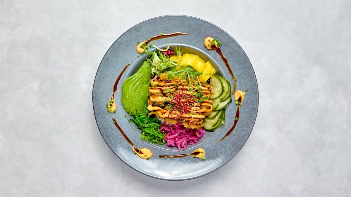 Pankofriterad tofu med ris, salladsmix, gurka, avokado, mango, picklad rödlök, edamame & wakame. Toppas med vegansk chilimayo, teriyakisås, sesamfrön & gräslök