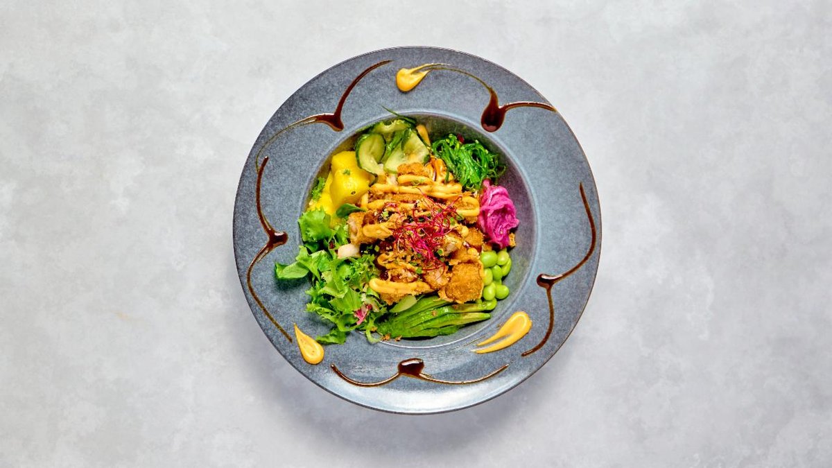 Shrimp tempura med ris, salladsmix, gurka, avokado, mango, picklad rödlök, edamame & wakame. Toppas med rostad lök, chilimayo & teriyakisås.