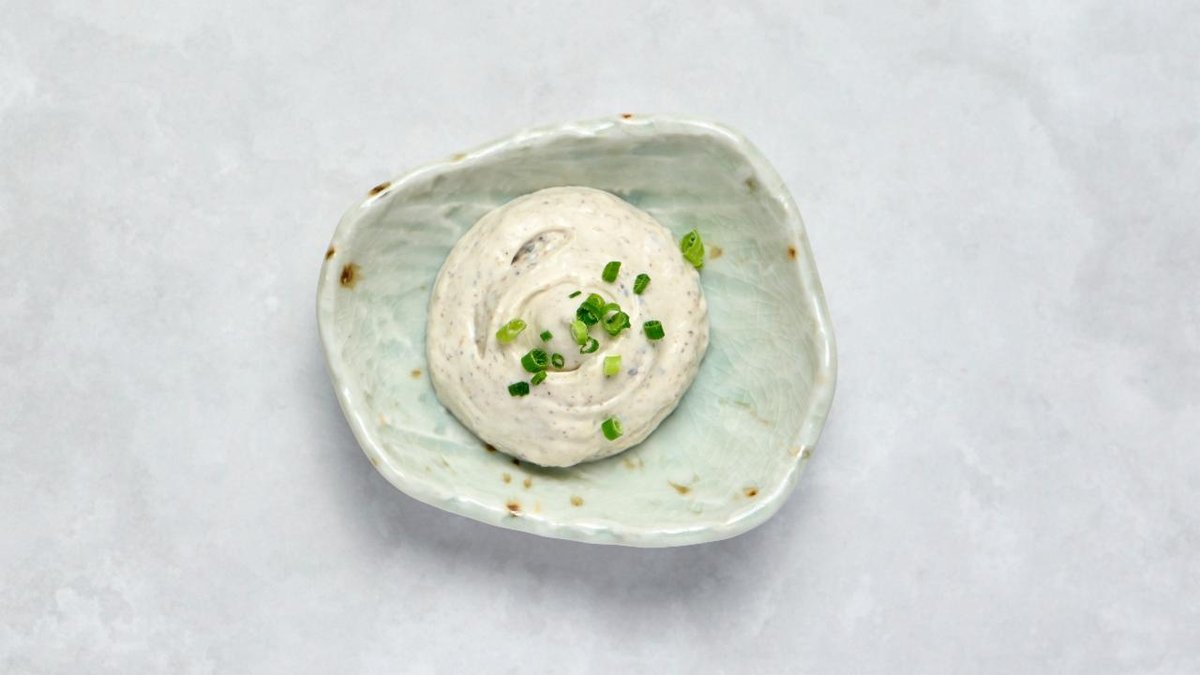 Krämig hemlagad misosoppa med grädde, serveras med purjolök.