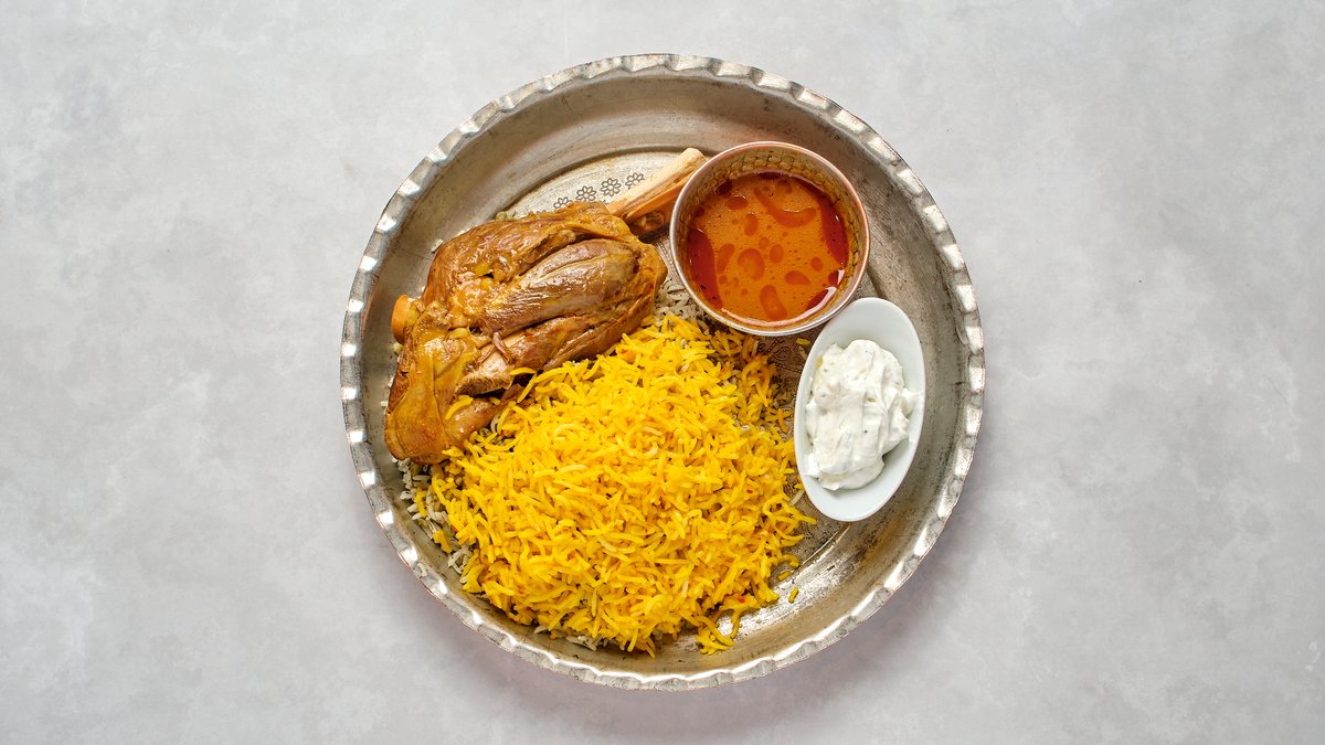Grillad hem-malet lammfärs med inbakad kycklingfilé. Serveras med zaffran ris.