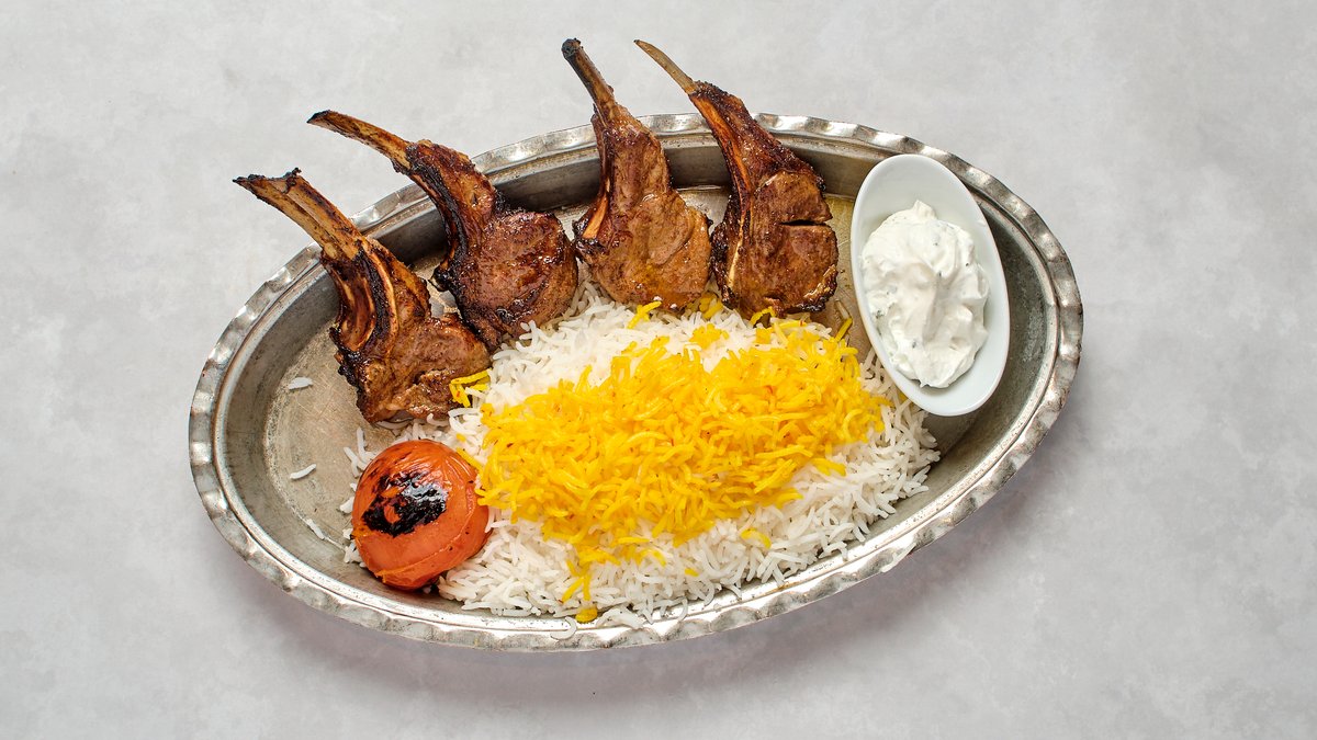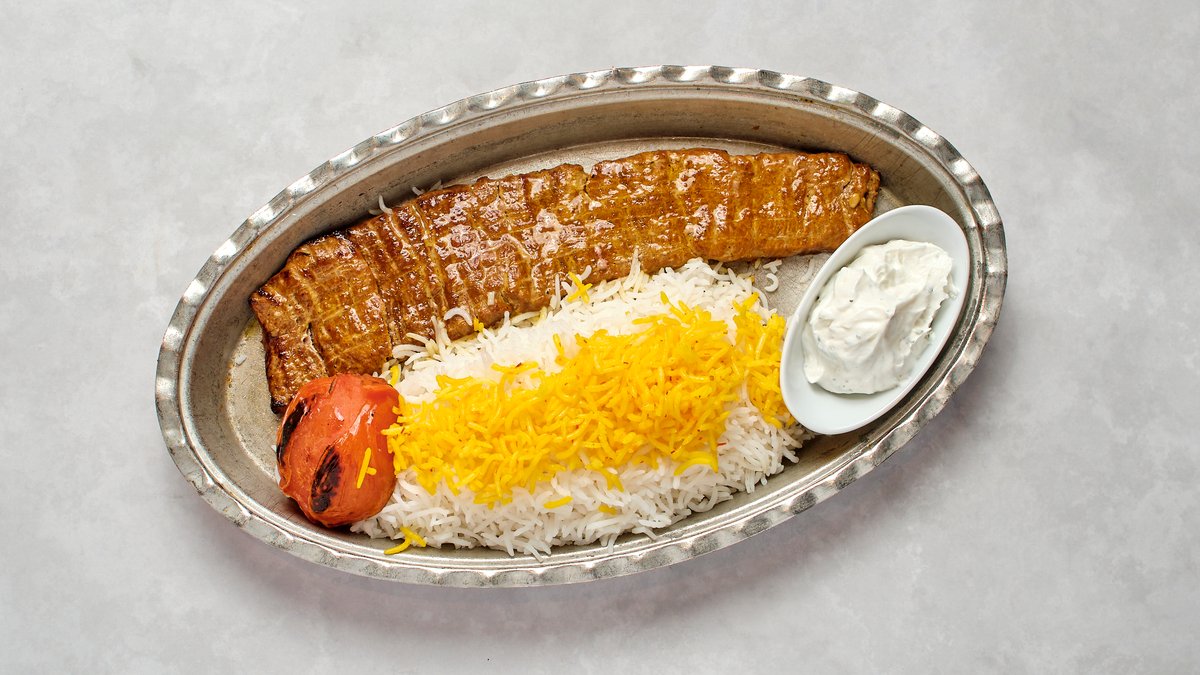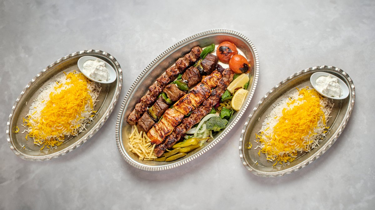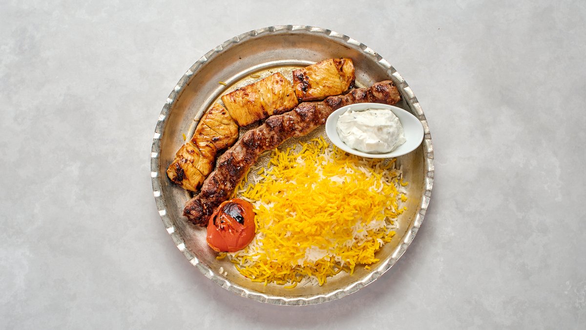 Grillad koobideh, jujeh, chenjeh, shishlik. Serveras med zaffran ris och grillad tomat.