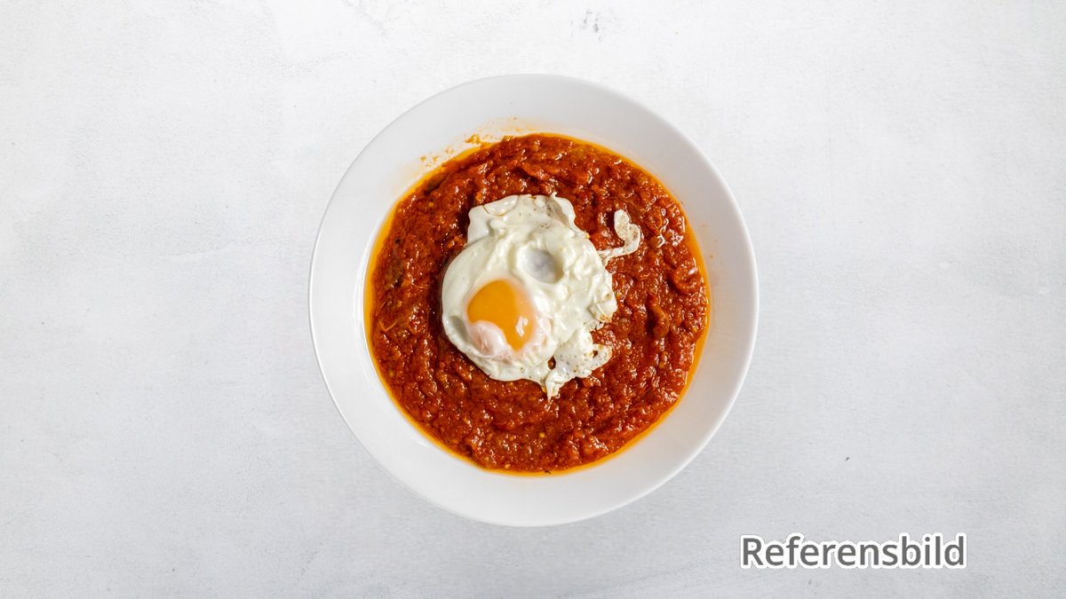 Rökt aubergine tillagad med tomat, ägg och vitlök.