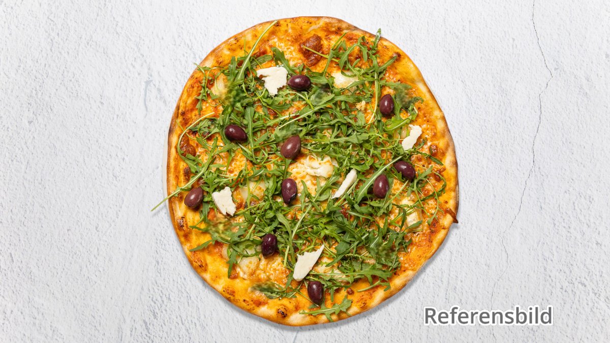 Tomatsås, ost, lök, paprika, champinjoner, oliver och feferoni.