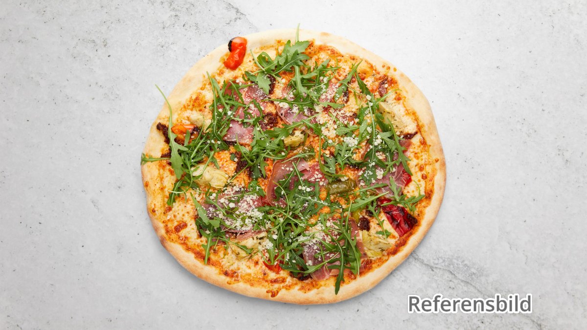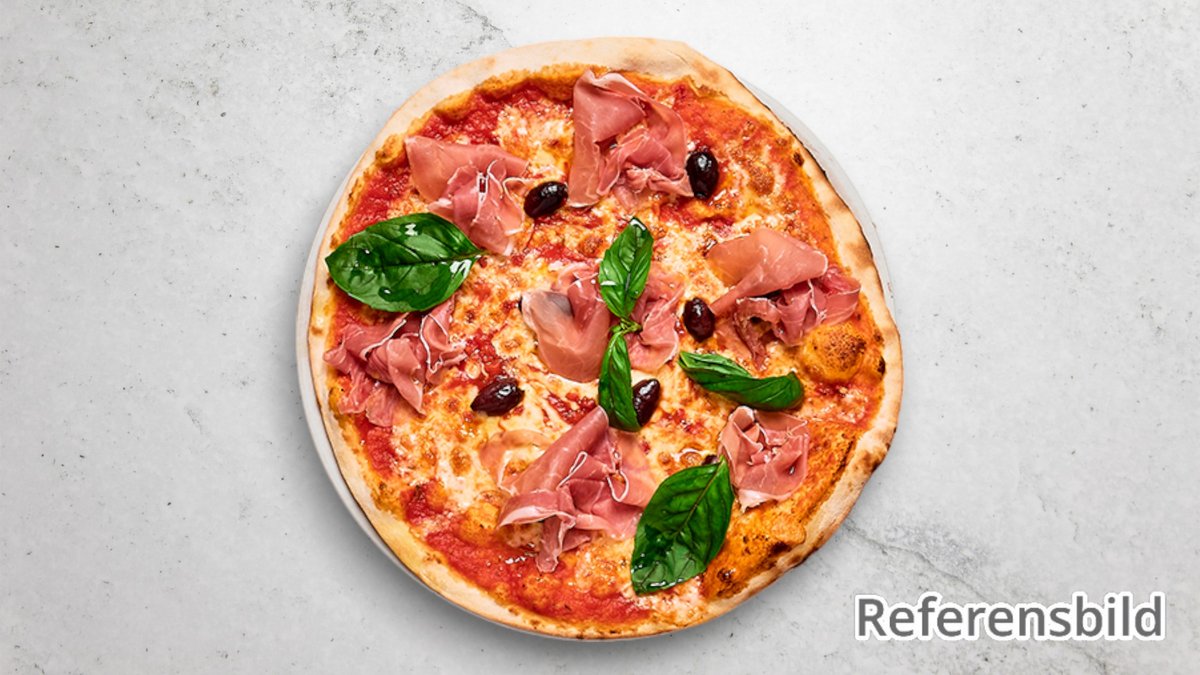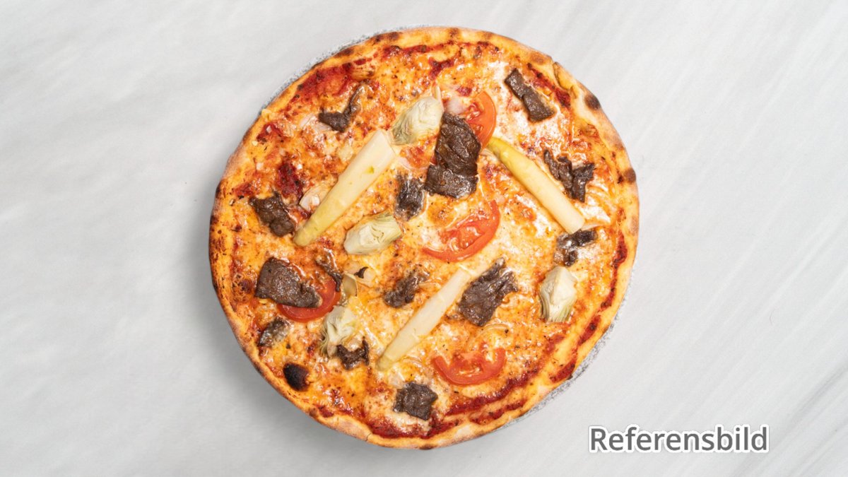 Tomatsås, ost, skinka, champinjoner, räkor, köttfärs, lök och vitlök.