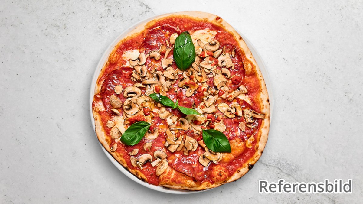 Tomatsås, ost, skinka och champinjoner. (Pizza med lock).