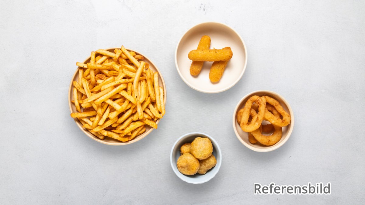 4 st lökringar, 4 st chicken nuggets, 3 st chili cheese och 2 st mozzarella sticks.