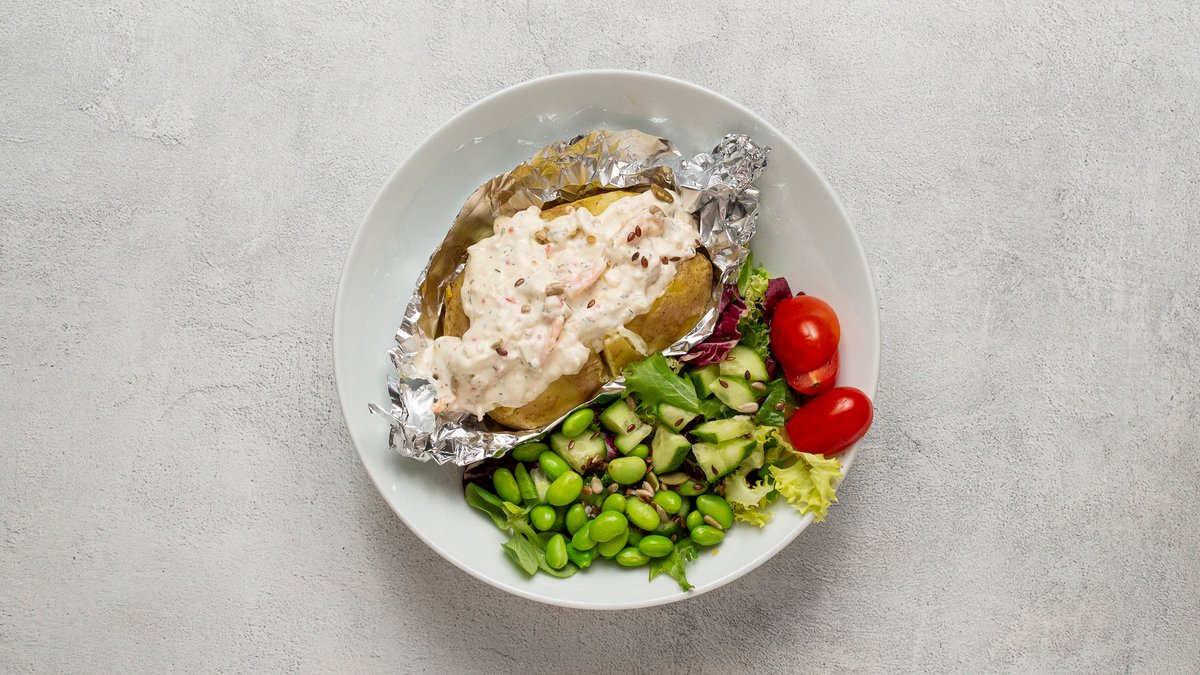 Alla våra bakad potatisrätter serveras med sidosallad och en brödbit.