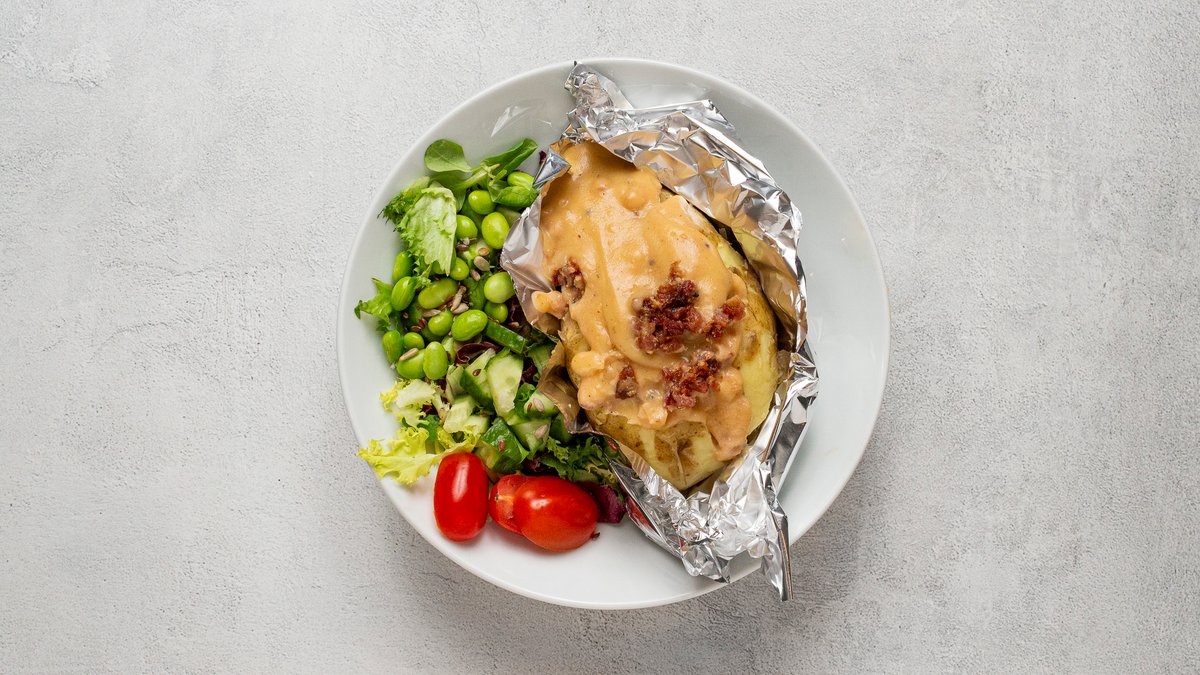 Bakad potatis fylld med krämig ädelost, crémefraiche baserad sås och stekta krispiga baconbitar.