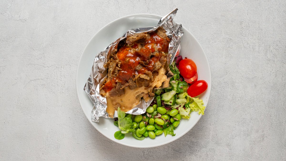Bakad potatis fylld med krämig ädelost och créme fraiche baserad sås. Toppad med kebab och sweetchilli dressing.