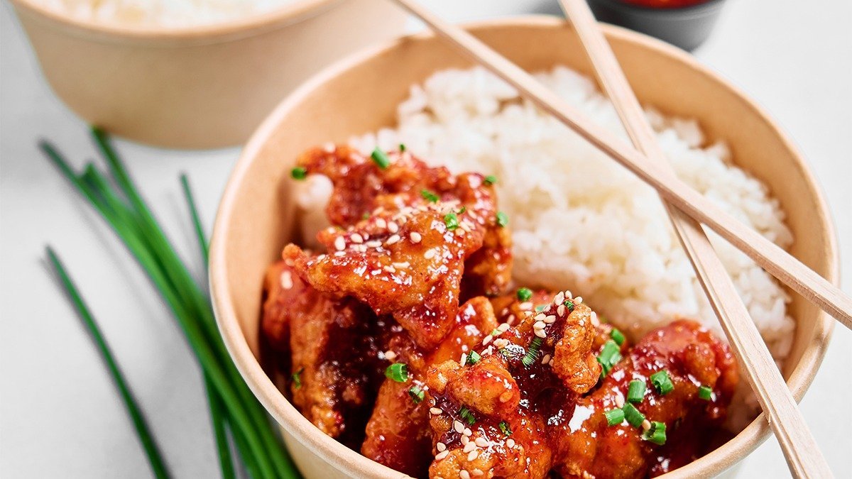 Friterad kyckling med valfri hemlagad sås, serverad med ris och picklad rättika.