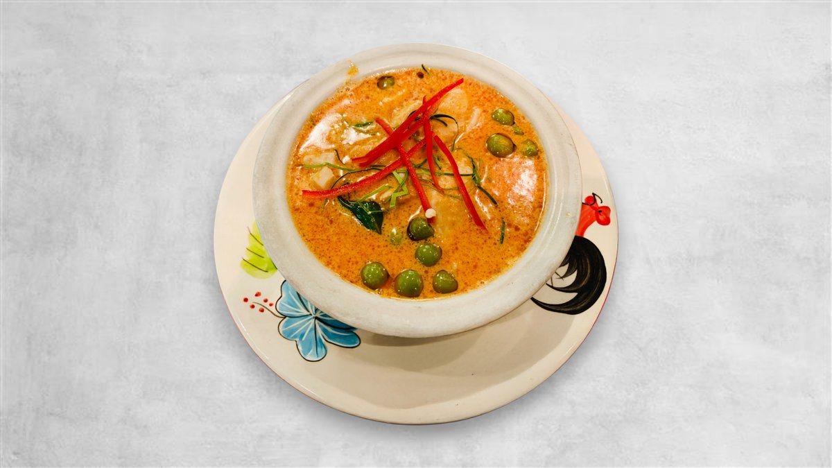 Gryta med panaeng curry, kokosmjölk, liten thai aubergine, citronblad, sötbasilika och röd chili. Serveras med jasminris.