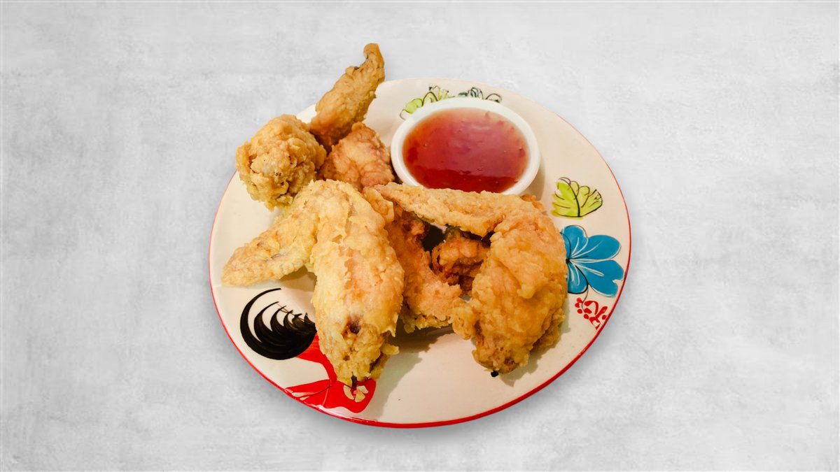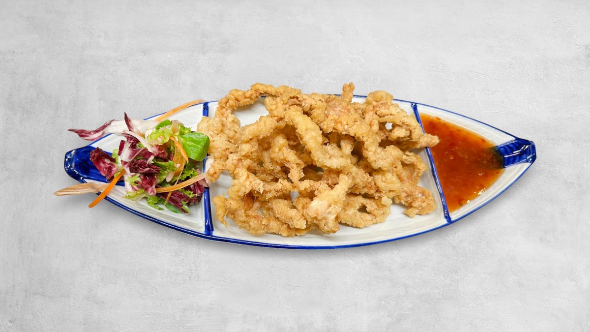 Friterad hel fisk med vitlök och koriander. Serveras med chilisås och jasminris.