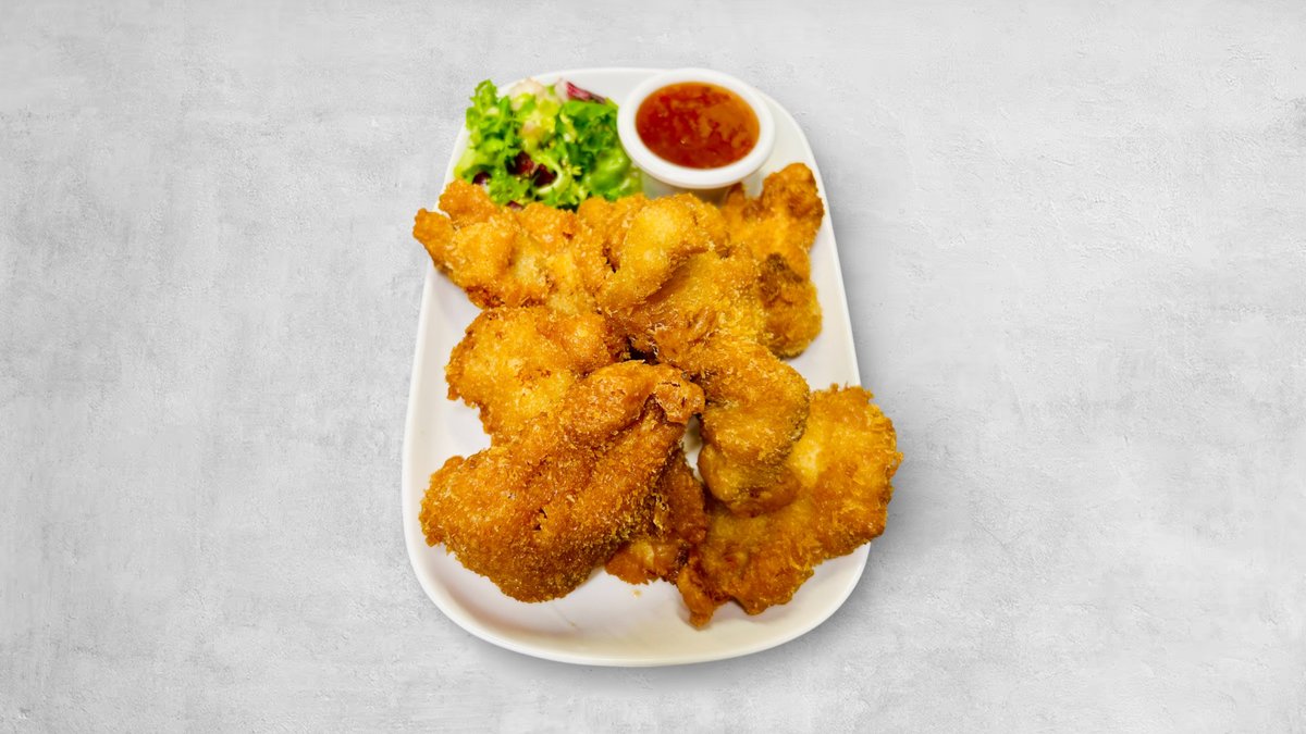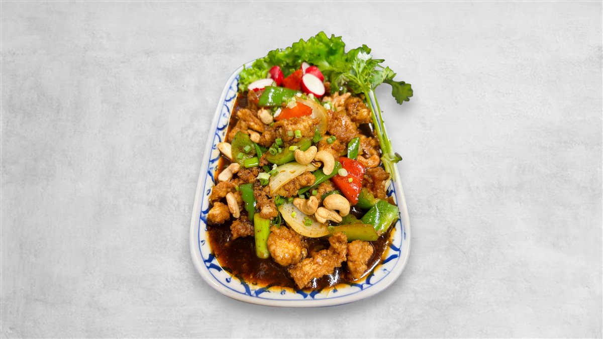 Friterad hel röd tilapia i sweet chilisås, ananas, lök, paprika, cashewnötter och koriander. Serveras med jasminris.