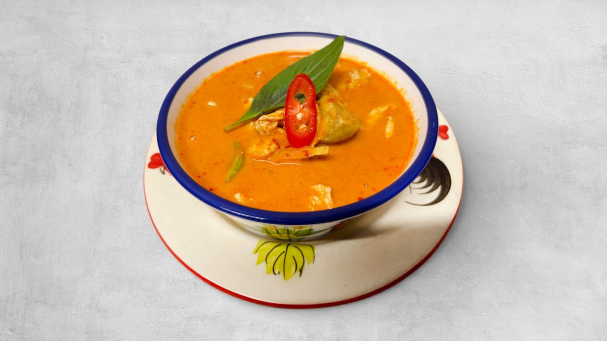 Wok i stark röd currysås, chili, thai aubergine, bambuskott, citronblad, kaempfer, söt basilika och pepparkorn. Serveras med jasminris.
