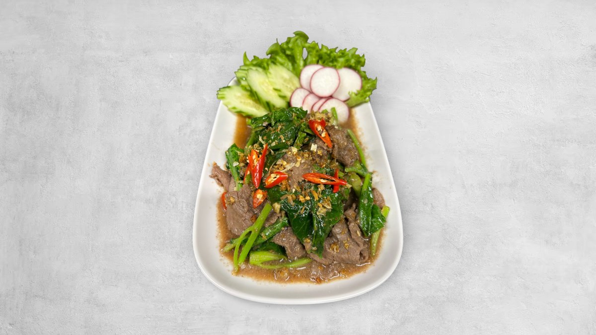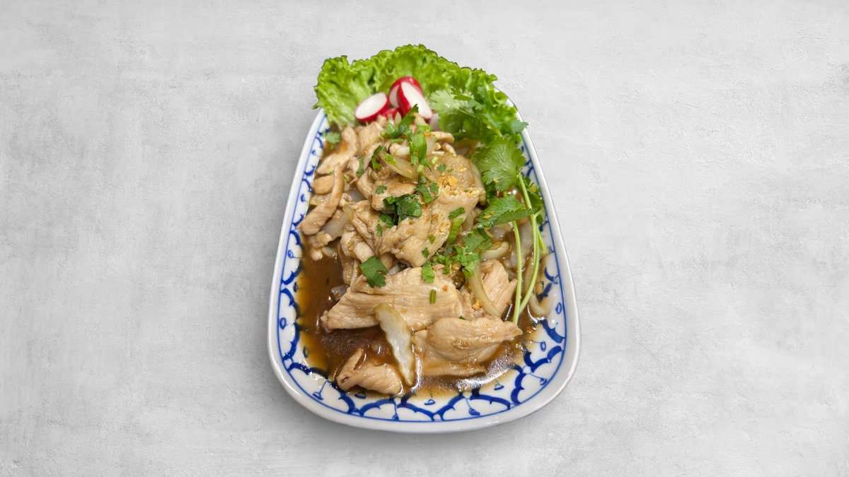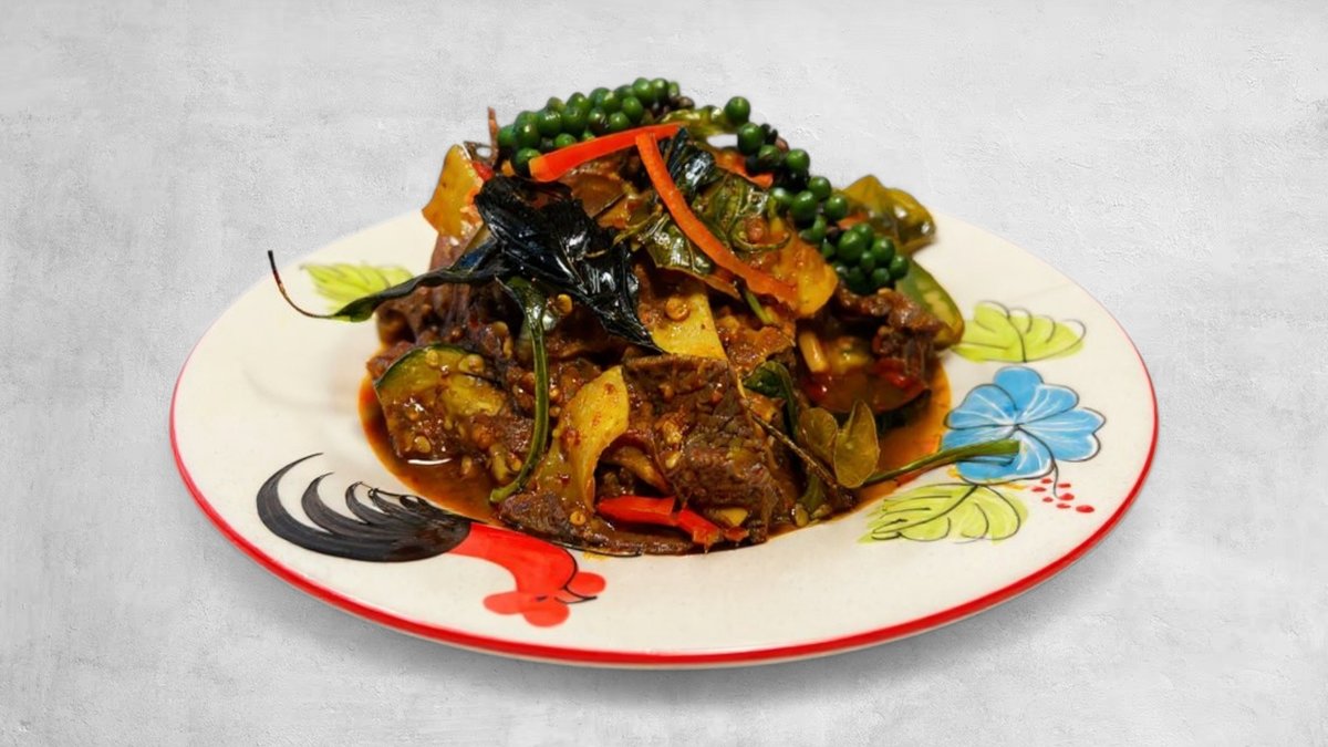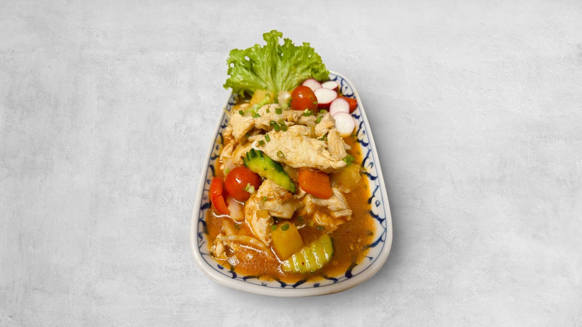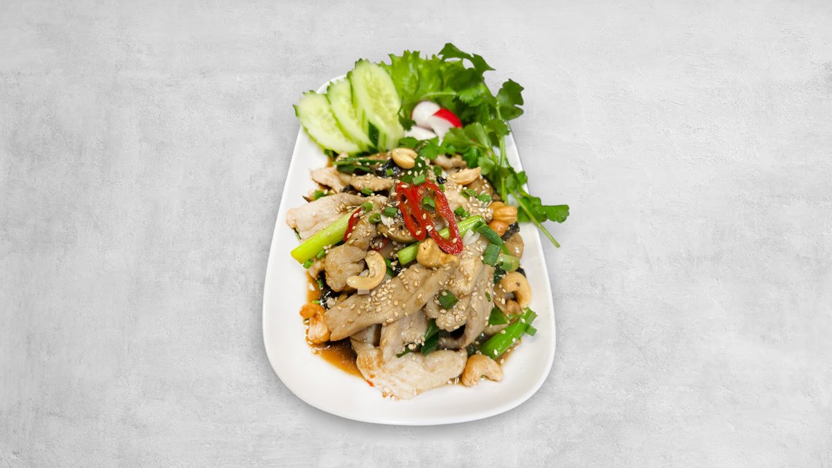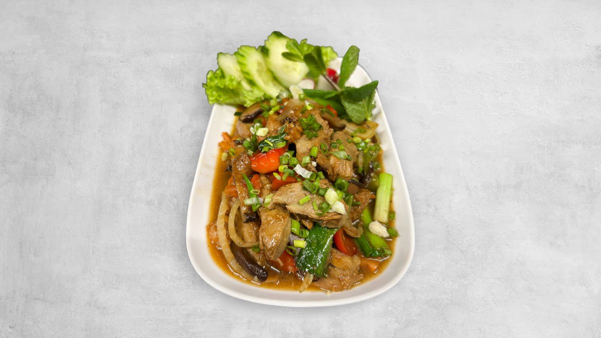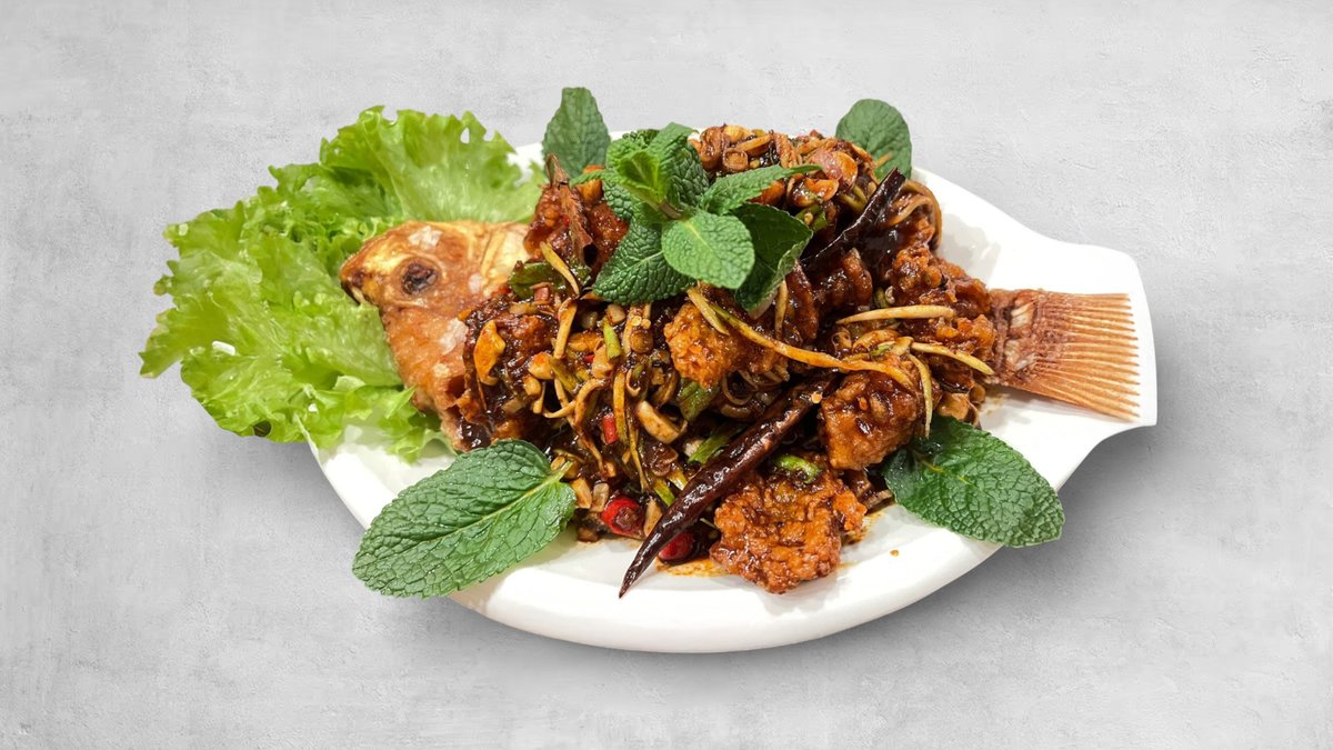 Friterad hel röd tilapia i het chilipastasås, citronblad, citrongräs, rödlök, vitlök, ingefära, mexikansk koriander, mango, cashewnötter, chili, friterad chilifrukter och mynta. Serveras med jasminris.
