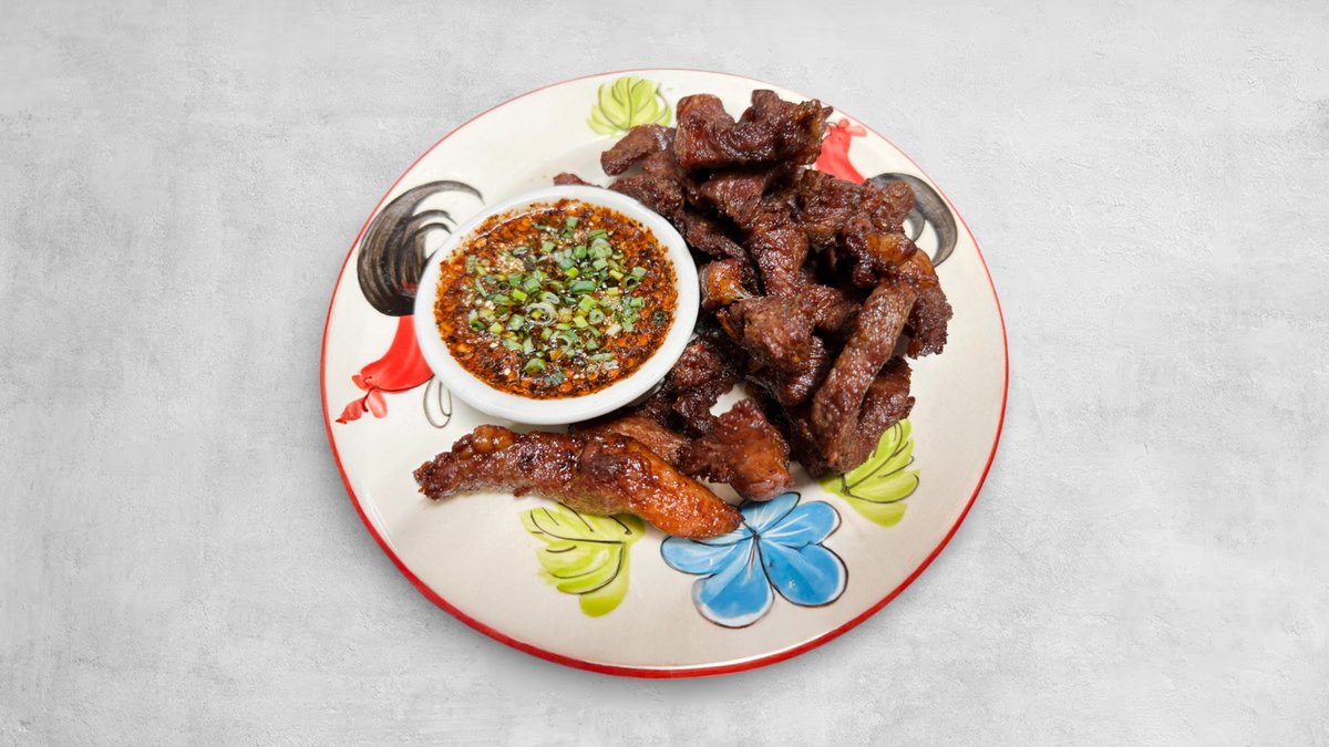 Stark och syrlig grillad entrecote med rödlök, salladslök, mexikansk koriander, mynta och chili. Serveras med jasminris.