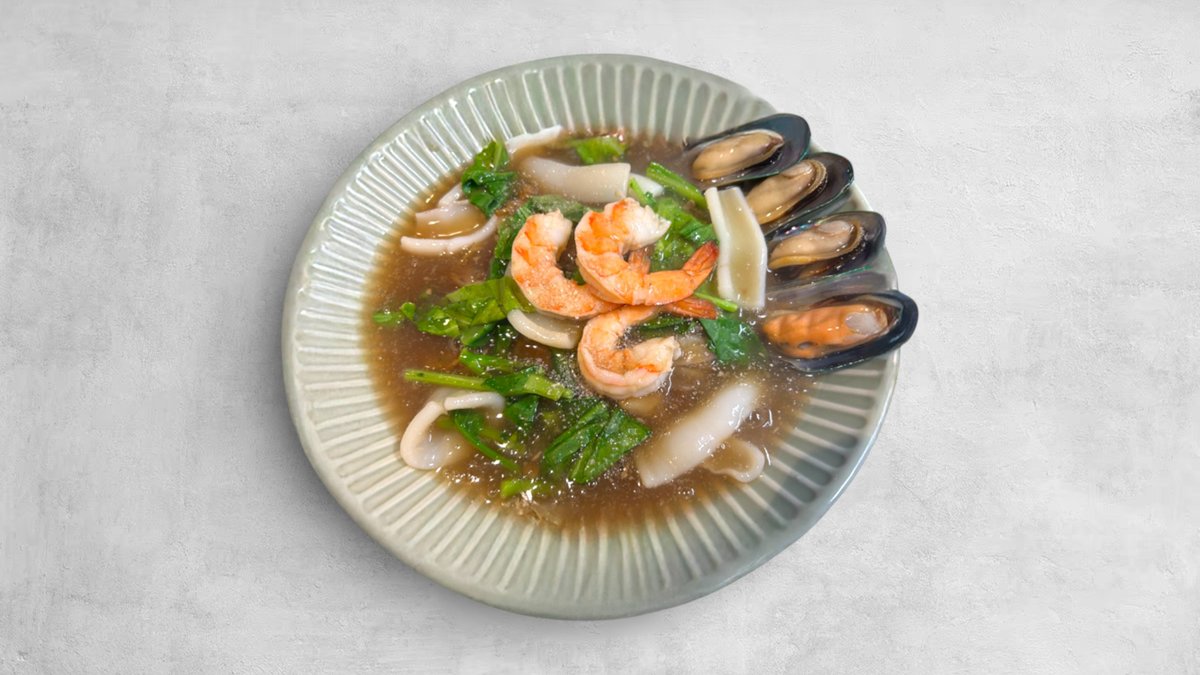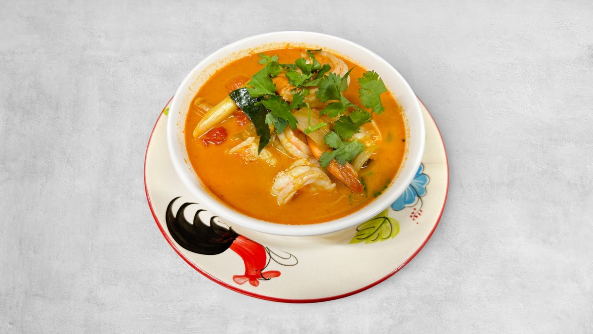 Stark och syrlig soppa med jätteräkor, musslor, bläckfisk, chilipasta, chili, kokosmjólk, galangal, citrongräs, citronblad, lök, tomat, champinjoner, mexikansk koriander och koriander. Serveras med jasminris.