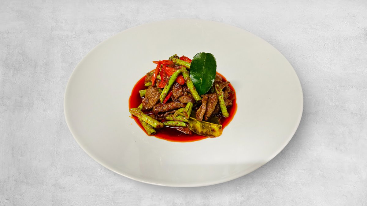Wok med röd curry, långa bönor, citronblad, röd och grön chili. Serveras med jasminris.