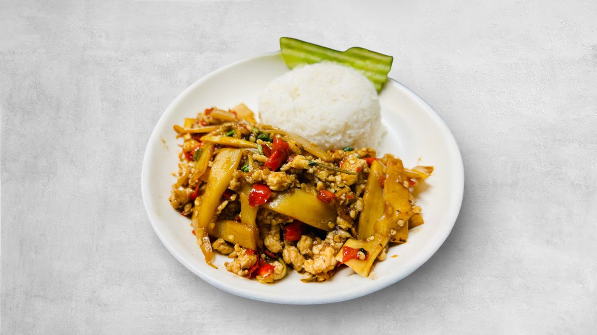 Kryddig bambuskott med rödlök, mexikansk koriander, mynta, chili och sesamfrön. Serveras med jasminris.