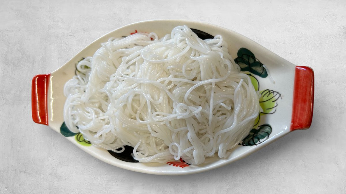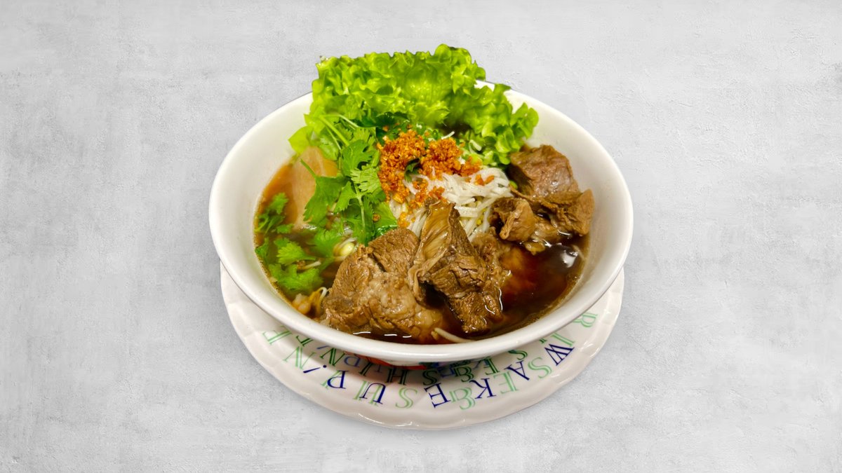 Nudelsoppa med rättika, böngroddar, koriander, salladslök, vitpeppar och friterad vitlök. Serveras med krossade jordnötter, chilipulver och vinäger.