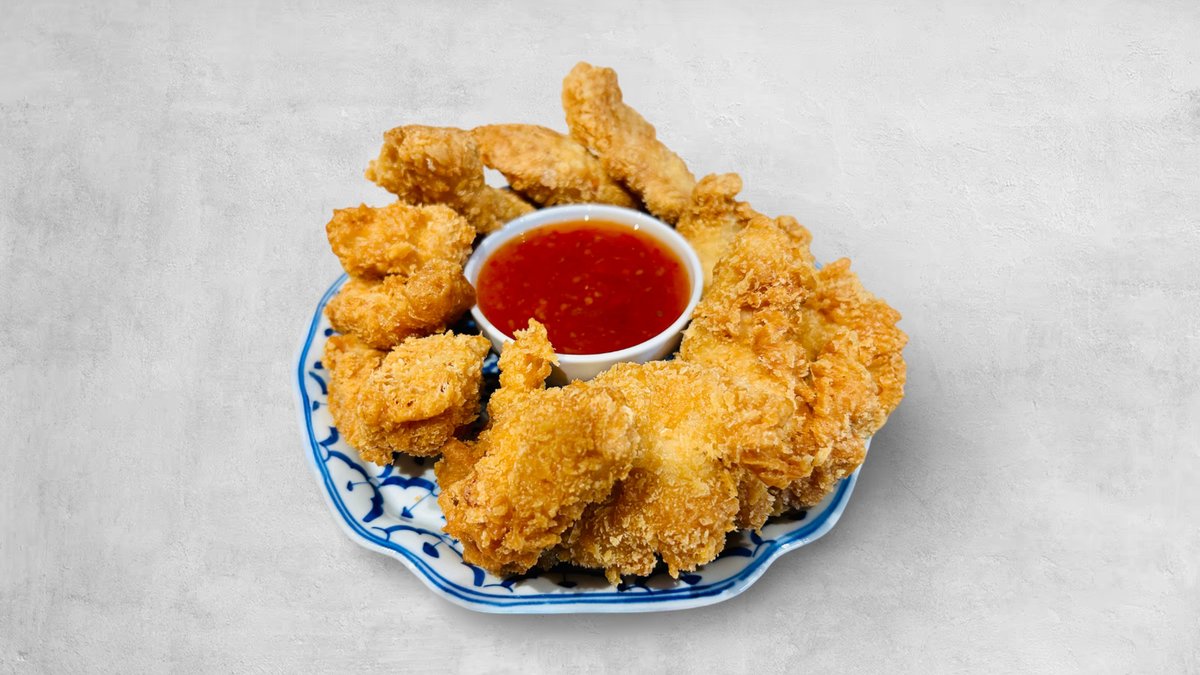 Friterad entrecote. Serveras med jasminris och chilisås.