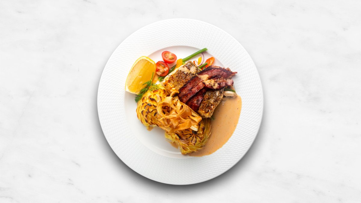 Baconlindad. Med pommes duchesse och hummersås.