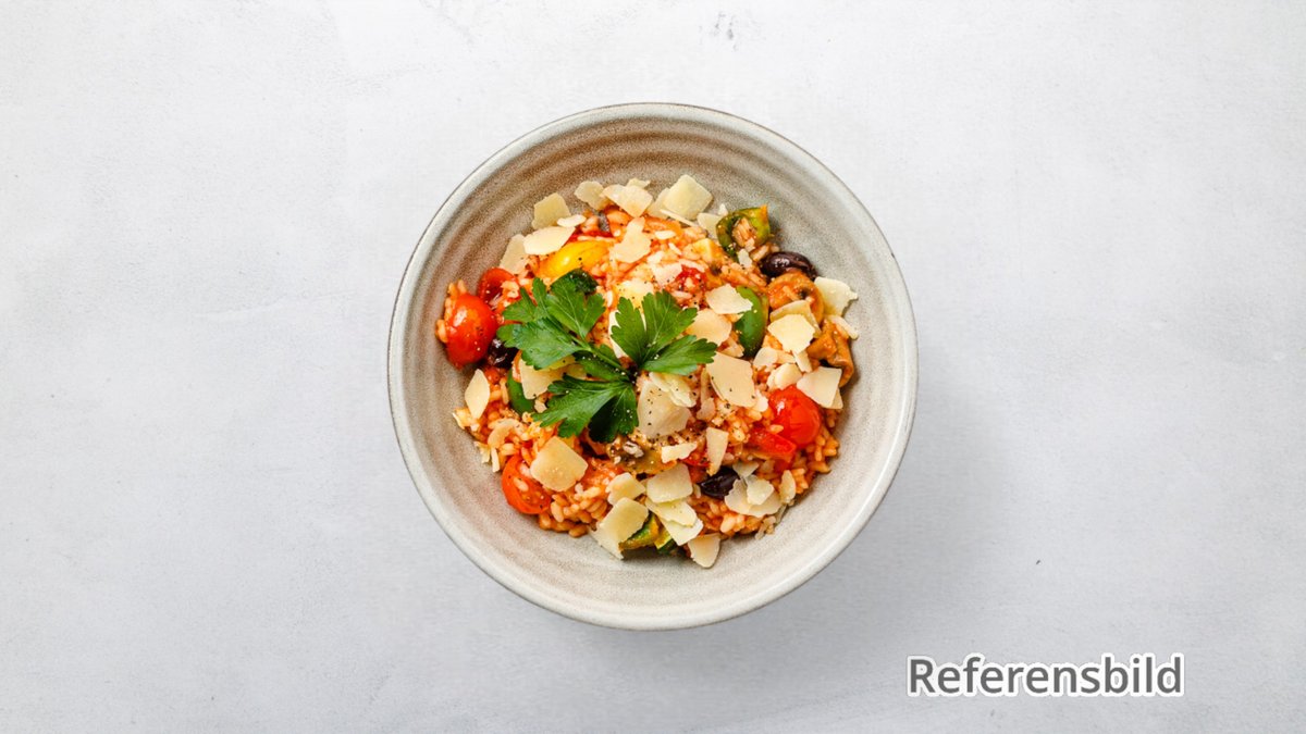 Med grönsaksrisotto och tomatpesto.