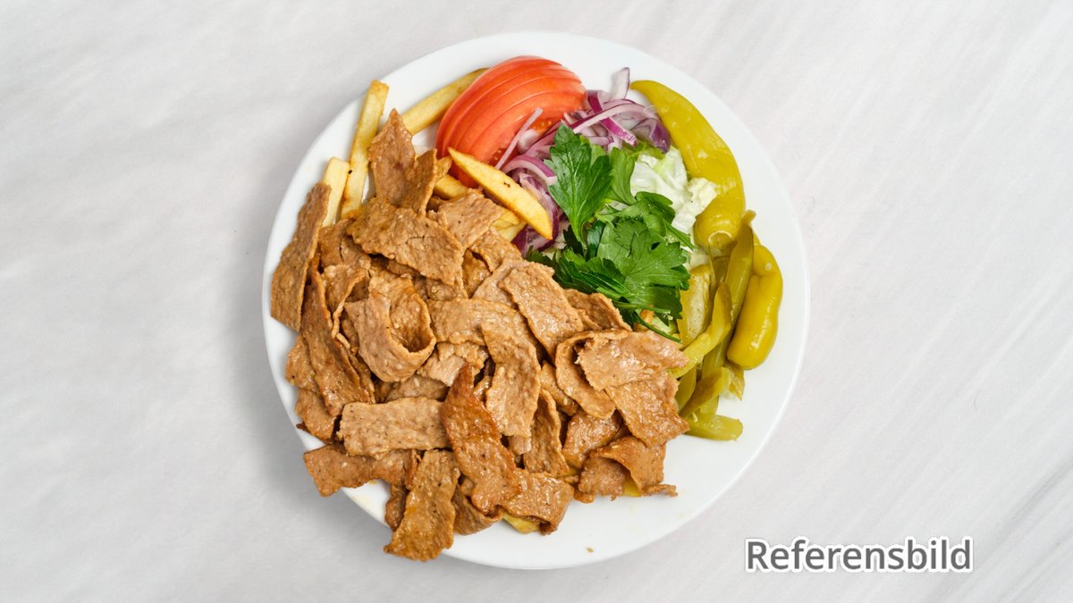 Tomatsås, ost, oxkött, kebabkött, lök och bearnaisesås.