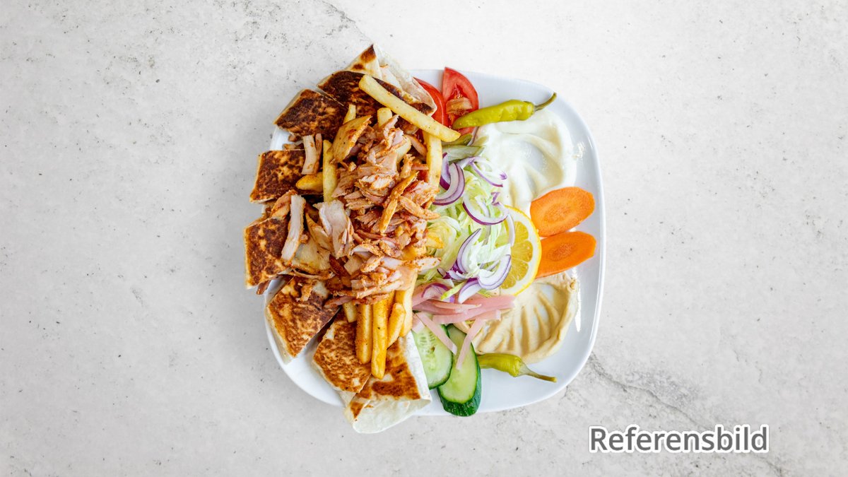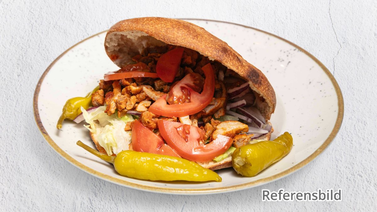 Tomatsås, ost, shawarma kycklingkebab, lök, feferoni och kebabsås.