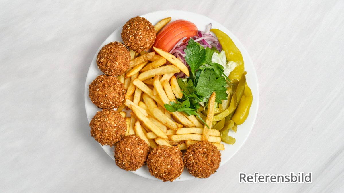 Serveras med 4 st falafel, hemgjord hummus och falafels i hembakat pita bröd.