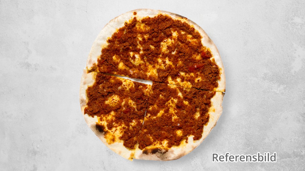 Tomatsås, ost, skinka, köttfärs, jalapeño, lök och vitlök.
