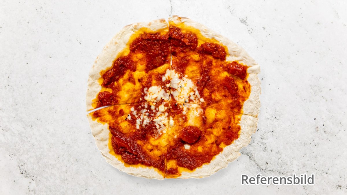 Tomatsås, ost, köttfärs, pepperonikorv och lök.