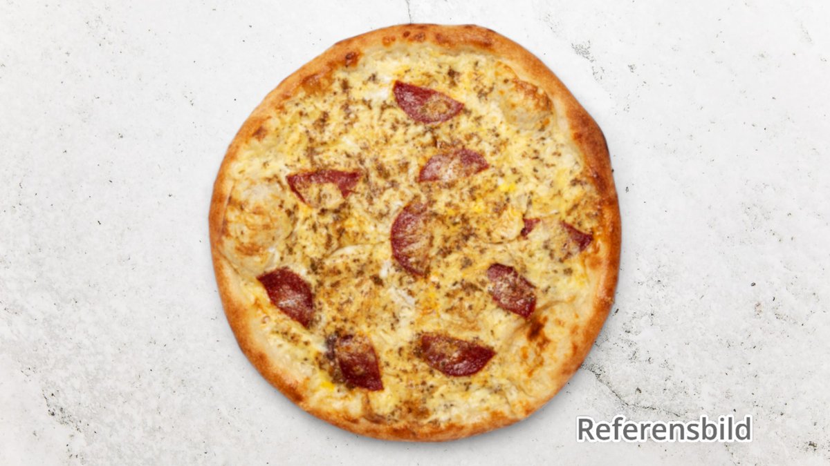 Tomatsås, ost, två olika salamis, lök och jalapeño.
