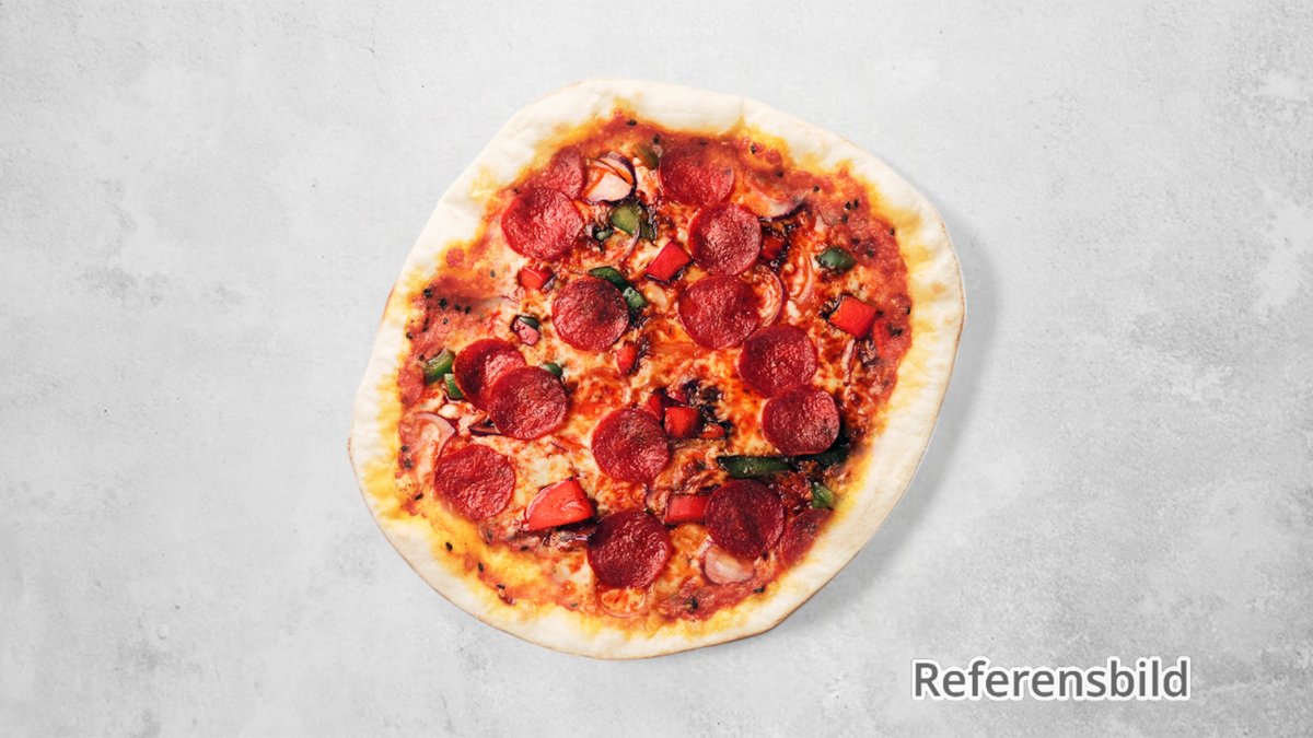 Tomatsås, ost, pepperonikorv, lök och feferoni.