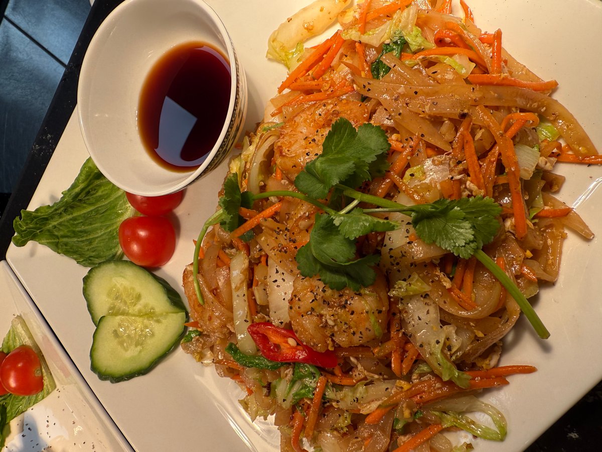 Stekta risnudlar med tiger räkor, ägg, grönsaker, böngroddar, lök och koriander.