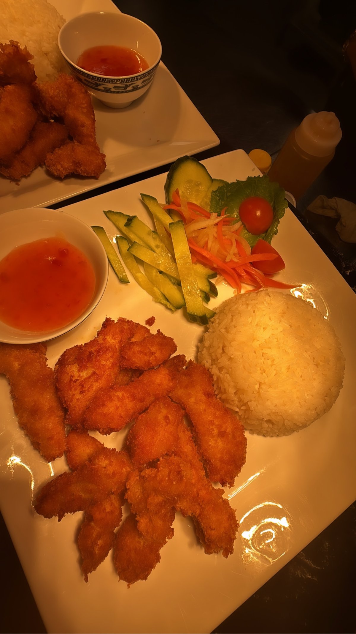 Krispig pankofriterade räkor som serveras tillsammans med en fyllig hemlagad sås och nykokt ris.