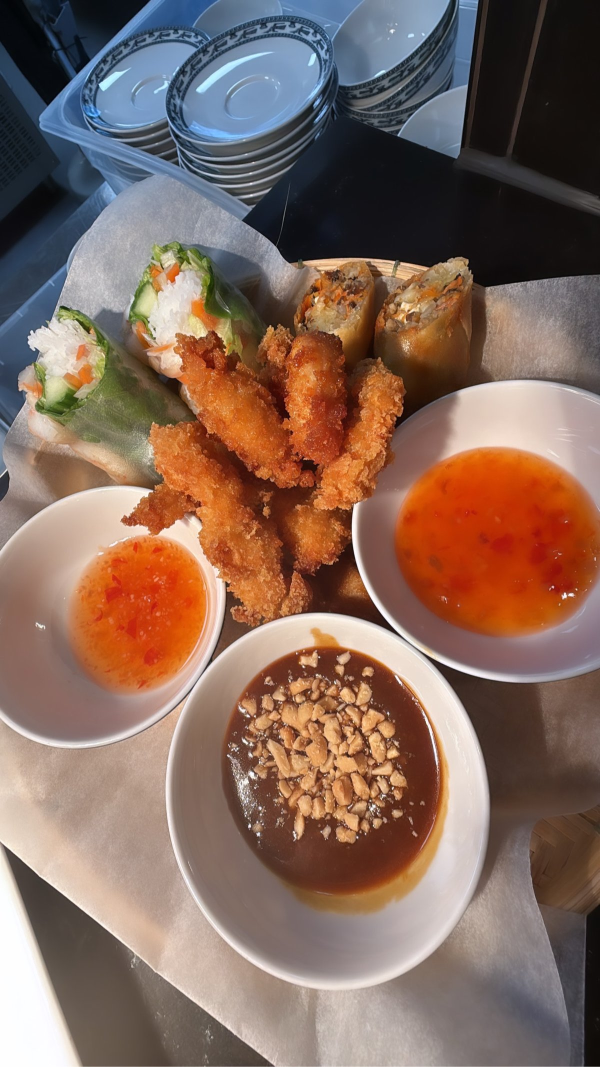 Färska vårrullar av rispapper med tofu, risnudlar, sallad, gurka och mynta. Serveras med hemlagad hoisinsås med jordnötter.