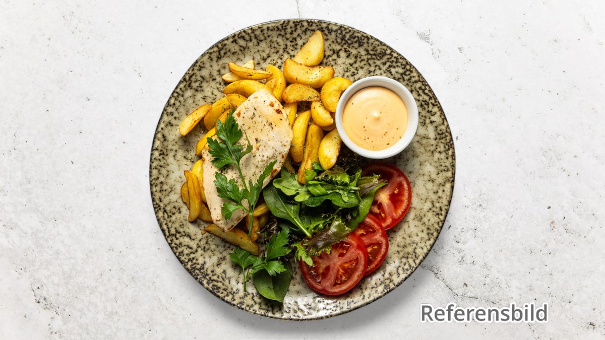 Med klyftpotatis och vitlökssås.
