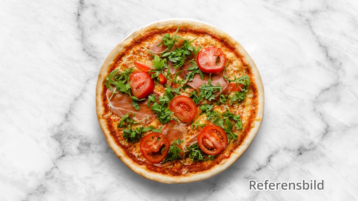 Tomatsås, mozzarella, parmaskinka och lök.
