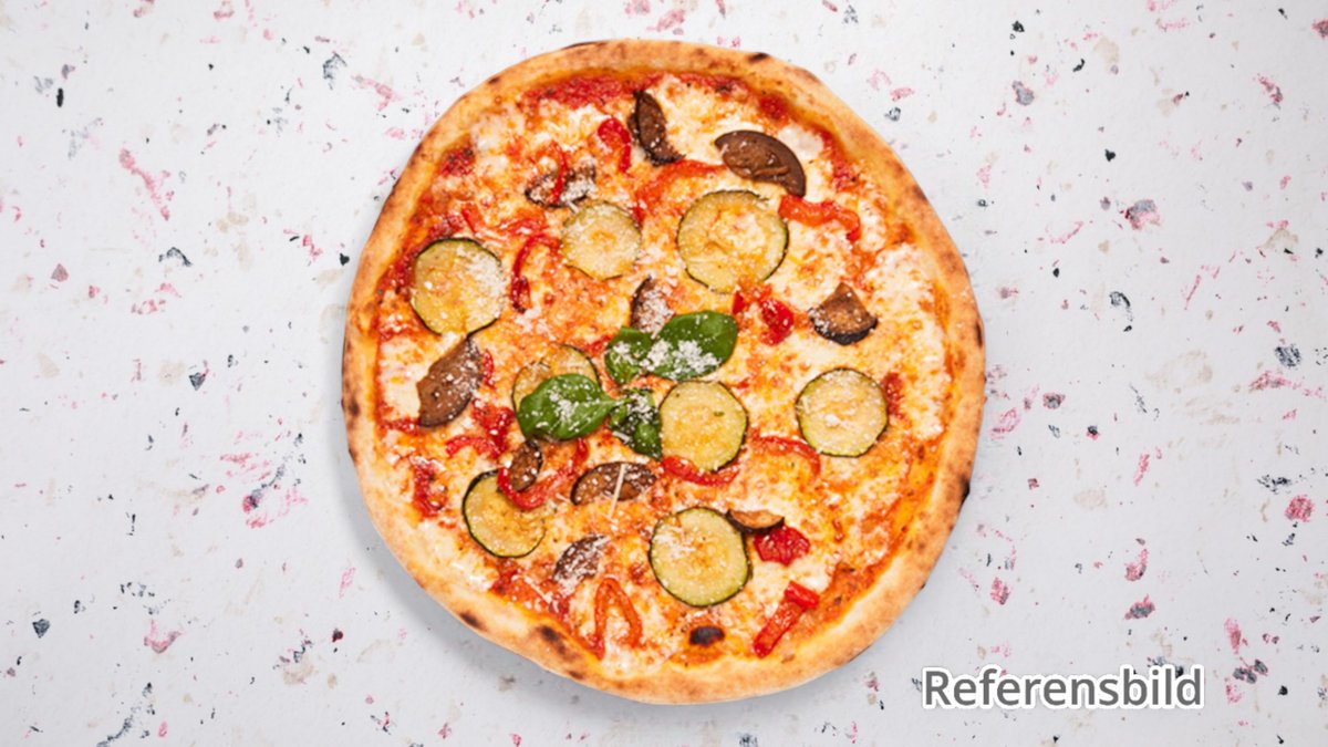 Tomatsås, mozzarella, zucchini, lök och soltorkadetomater.