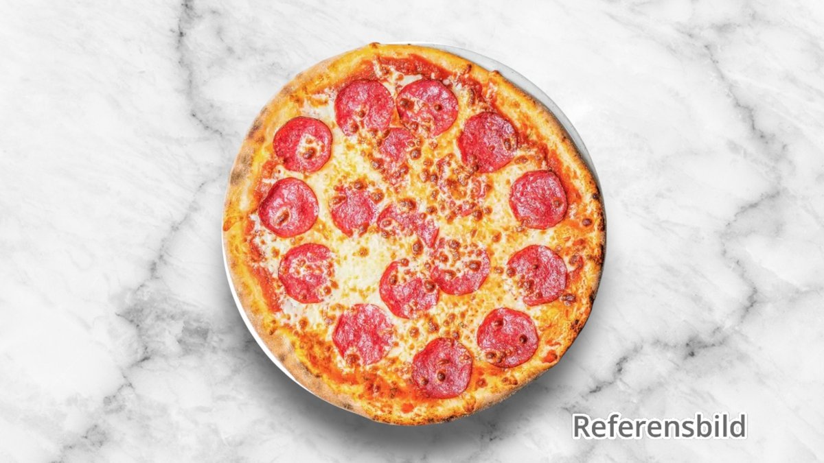 Tomatsås, mozzarella, salami och gorgonzola.
